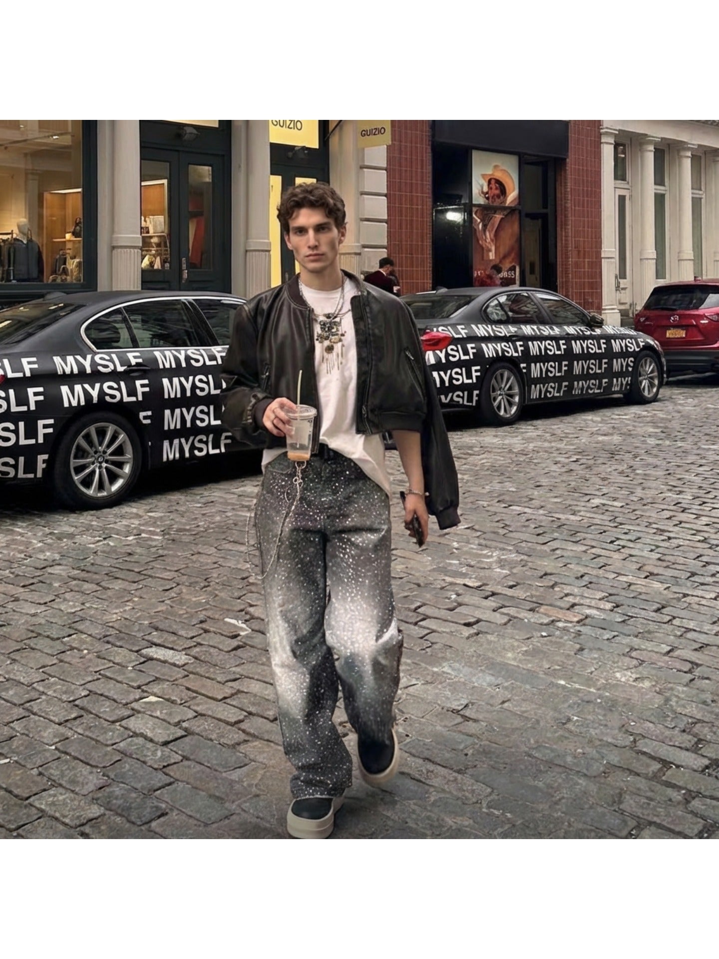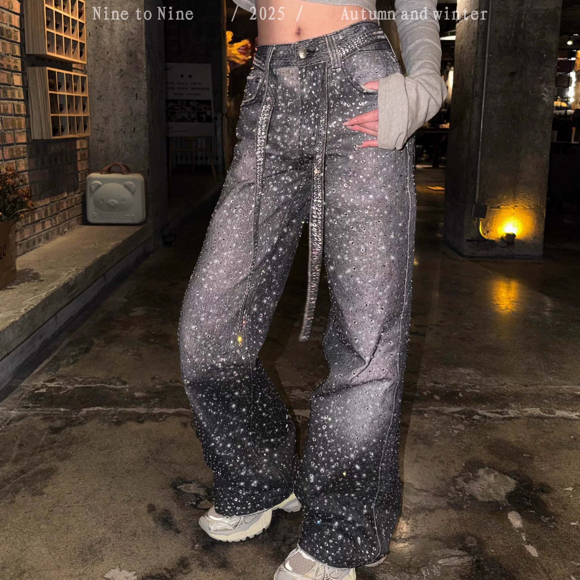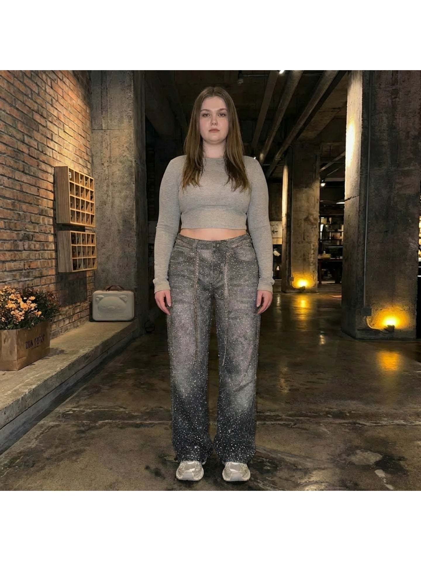Aesthetic Caption: "When fabric meets diamonds 💎 Our gradient rhinestone wide leg pants are the ultimate statement piece for your wardrobe. Unisex, slimming, and designed to make you shine."